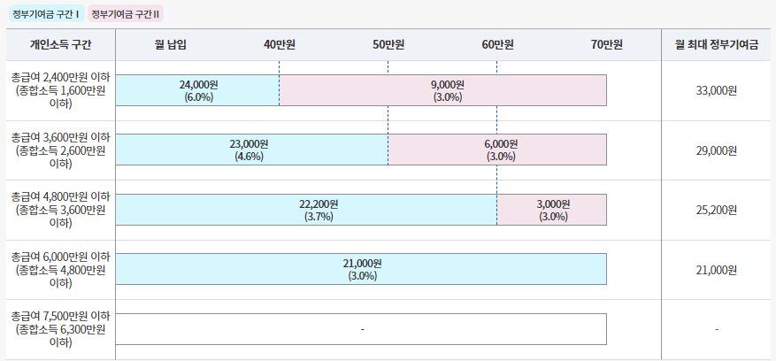 개인소득 구간에 따른 정부기여금 지급은 다음과 같습니다.